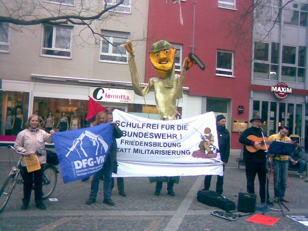 Die Mahnwache bei der eine Bundeswehr-Großpuppe den Werbefeldzug der Bundeswehr darstellte, fand auf dem Neubrunnenplatz in Mainz statt. Liedermacher Ernst Schwarz unterstützte die Friedensaktion musikalisch. In seinem Redebeitrag forderte Dr. Gernot Lennert eine Ende der Kooperation, da diese den Grundlagen politischer Bildung, dem Schulgesetz und der UN-Kinderschutzkonvention¹ widerspreche. Markus Pflüger kritisierte den umfassenden und zunehmenden Werbefeldzug der Bundeswehr. Dieser diene der Akzeptanzschaffung für weltweite Kriegseinsätze, und sogar Minderjährige würden direkt oder indirekt für das Kriegshandwerk rekrutiert. Ein Vertreter des Trierer Bündnisses Bundeswehr raus aus den Schulen erläuterte schließlich wie sich die Bundeswehr gemäß ihrem Auftrag für Wirtschaftsinteressen an Kriegen beteiligt. Ein Schüler forderte abschließend „Schulen ohne Militär“ und unterstrich die Kampagnenforderung „Bundeswehr-Schul-Kooperation kündigen, Friedensbildung statt Militarisierung!“