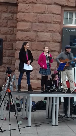 Ein Bündnis Mainzer Parteien hatte zur Kundgebung gegen den Ukraine-Krieg eingeladen. Neben Parteien kamen auch attac und die DFG-VK zu Wort. Für die DFG-VK sprach Veronika Gielow. Zuvor sang ihre Tochter Elisabeth eine Strophe des Liedes "Wozu sind Kriege da?, instrumentell begleitet von Rüdiger Schilp.